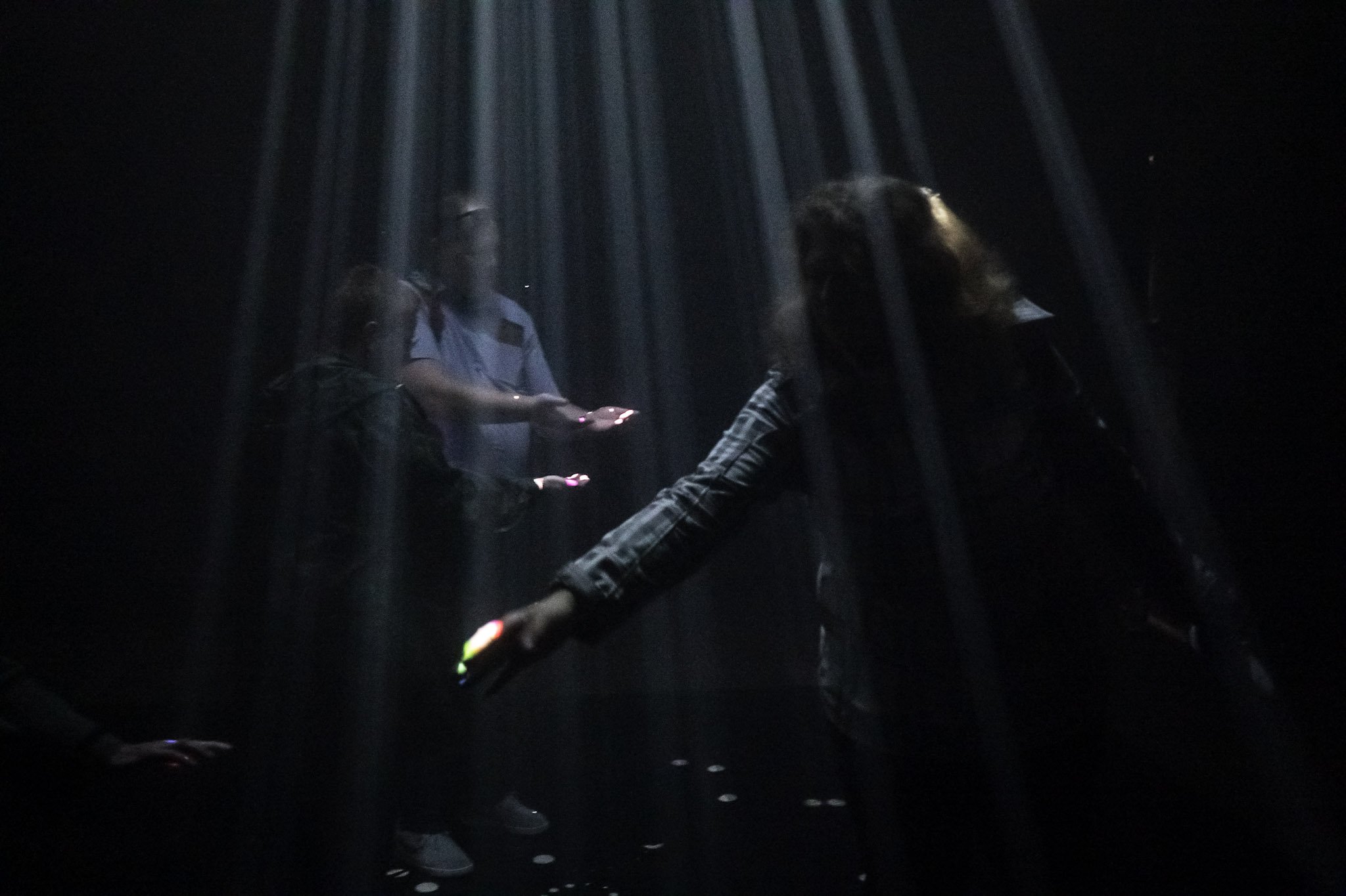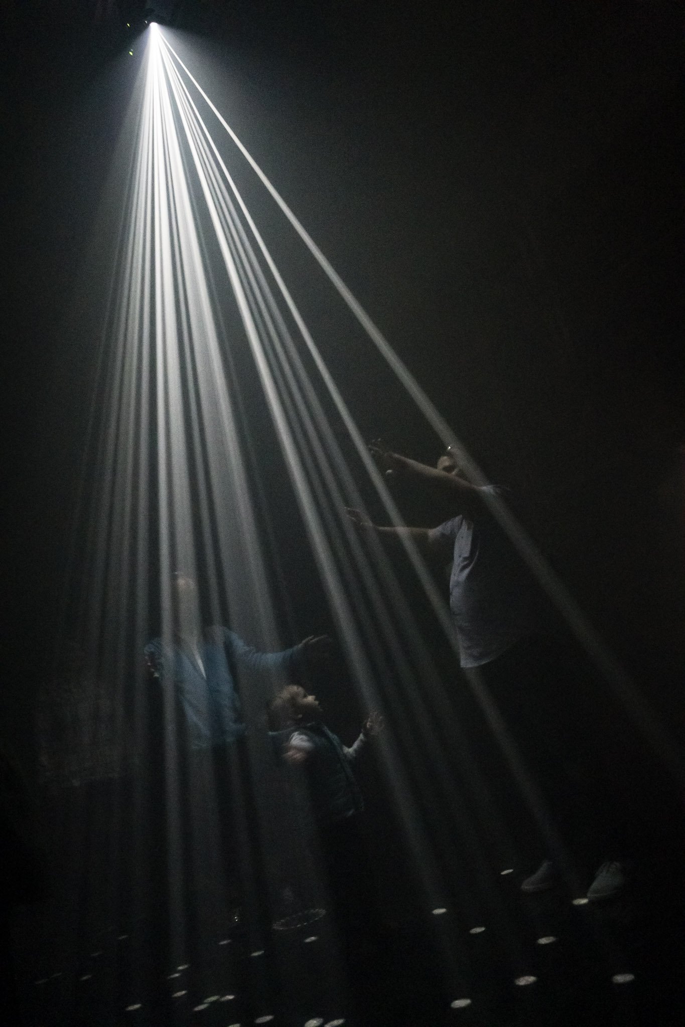 Divák může vyvážený stav narušit a instalaci tak oživit. Paprsky reagují na dotyk - odrážejí se od lidí, nabírají rychlost, mění směr a vyluzují nečekané zvuky.